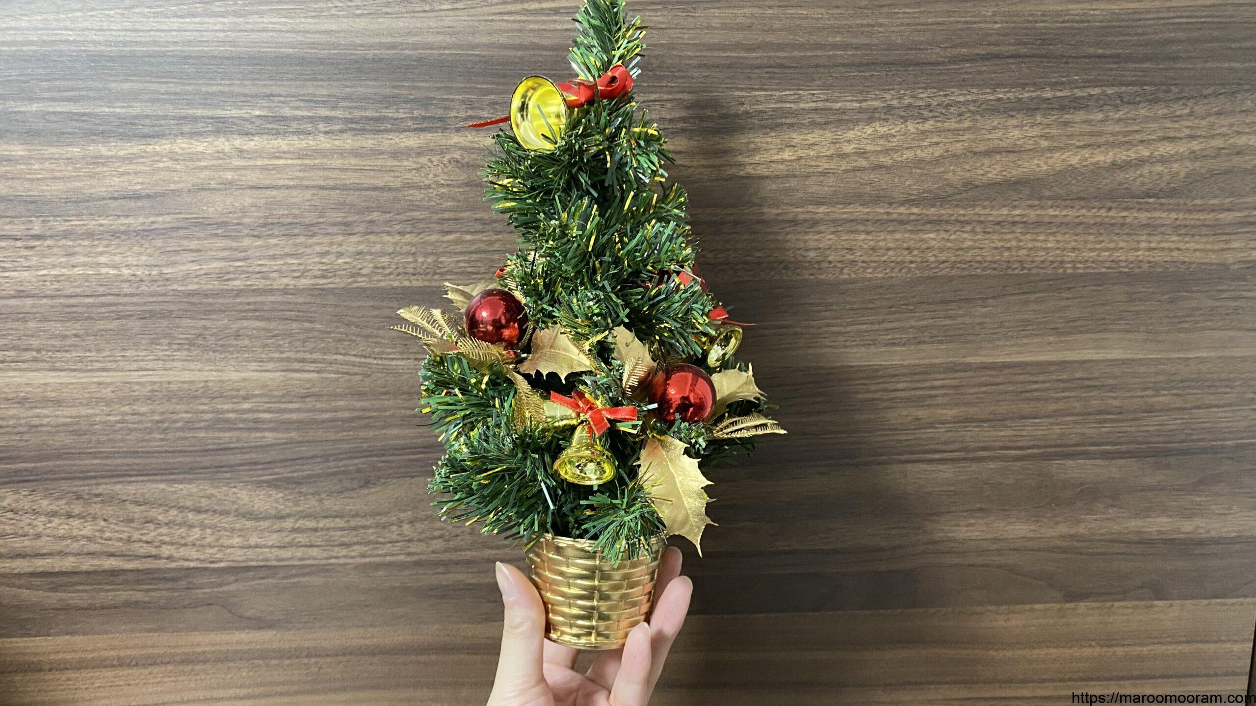 大きさはW18×D18×H30cmとなり、机の上で丁度いいサイズでした。値段も690円(税別)とコスパもよし!値段が安い物はクオリティも低かったりしますが、これはオーナメントもぎっしり付いていて安物特有のスカスカ感がありません。